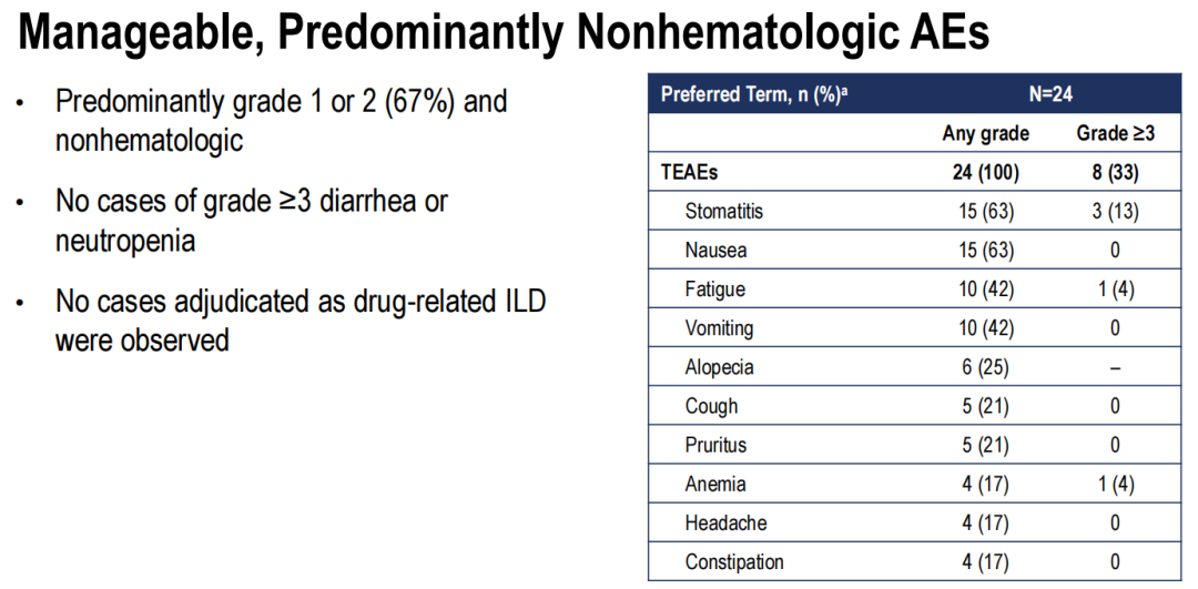 非血液学毒性可控:主要是1/2级非血液学毒性;无≥3级腹泻或中性粒细胞减少;无药物相关的间质性肺疾病。