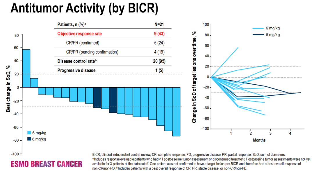 2. 新的疗效结果显示,Dato-DXd在转移性TNBC患者具有抗肿瘤活性:客观缓解率ORR为43%,疾病控制率为95%。