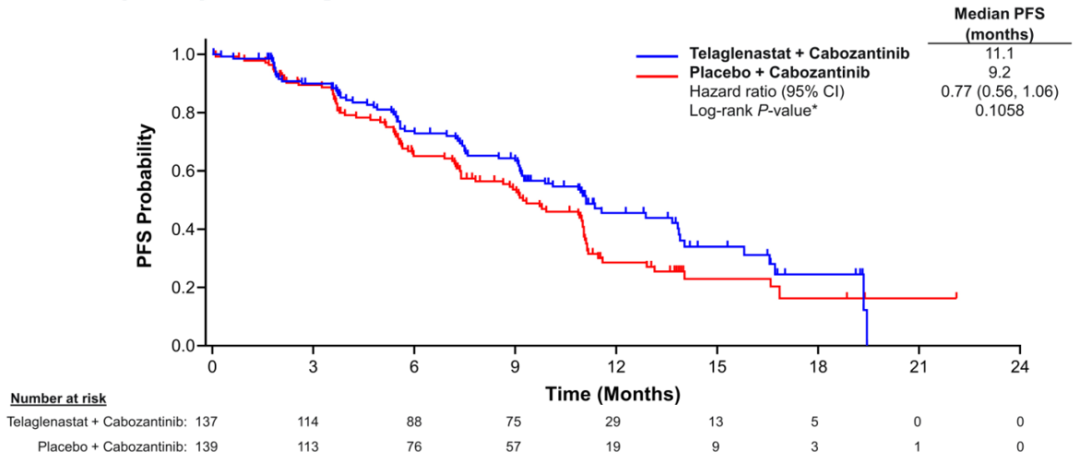 Telaglenastat+卡博替尼治疗mRCC的I期研究安全性和有效性令人鼓舞。但十分遗憾的是,这项全球、随机、安慰剂对照、双盲的CANTATA研究没有取得预期的研究结果,没有在卡博替尼的基础上进一步提高对mRCC的肿瘤控制(PFS)。