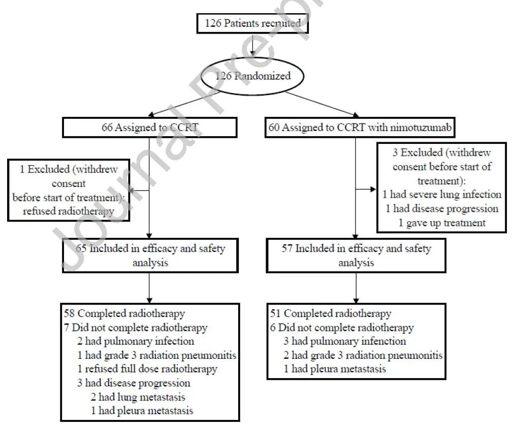 这是一项前瞻性、单中心、开放标签的随机II期临床研究,纳入组织病理学确认的初治鳞状非小细胞肺癌患者,患者分期为3a或3b期,年龄18~75周岁且具有一个可测量病灶,PS评分0~1分。既往接受过免疫治疗、放疗、化疗的患者不允许入组,腺鳞癌的患者同样不允许入组。符合入组标准的患者,按照1:1的比例,随机分为同步放化疗组或联合尼妥珠单抗组。同步放化疗方案如下:多西他赛25 mg/m2,顺铂25 mg/m2,第1、8、15、22及29天给药,尼妥珠单抗200mg,每周给药一次。放疗剂量参照标准剂量进行。同步放化疗结束后,2个月内进行首次随访,前两年每3个月进行一次随访,随后每6个月进行一次随访。本研究主要研究终点OS,次要研究终点PFS、ORR、失败方式及安全性。