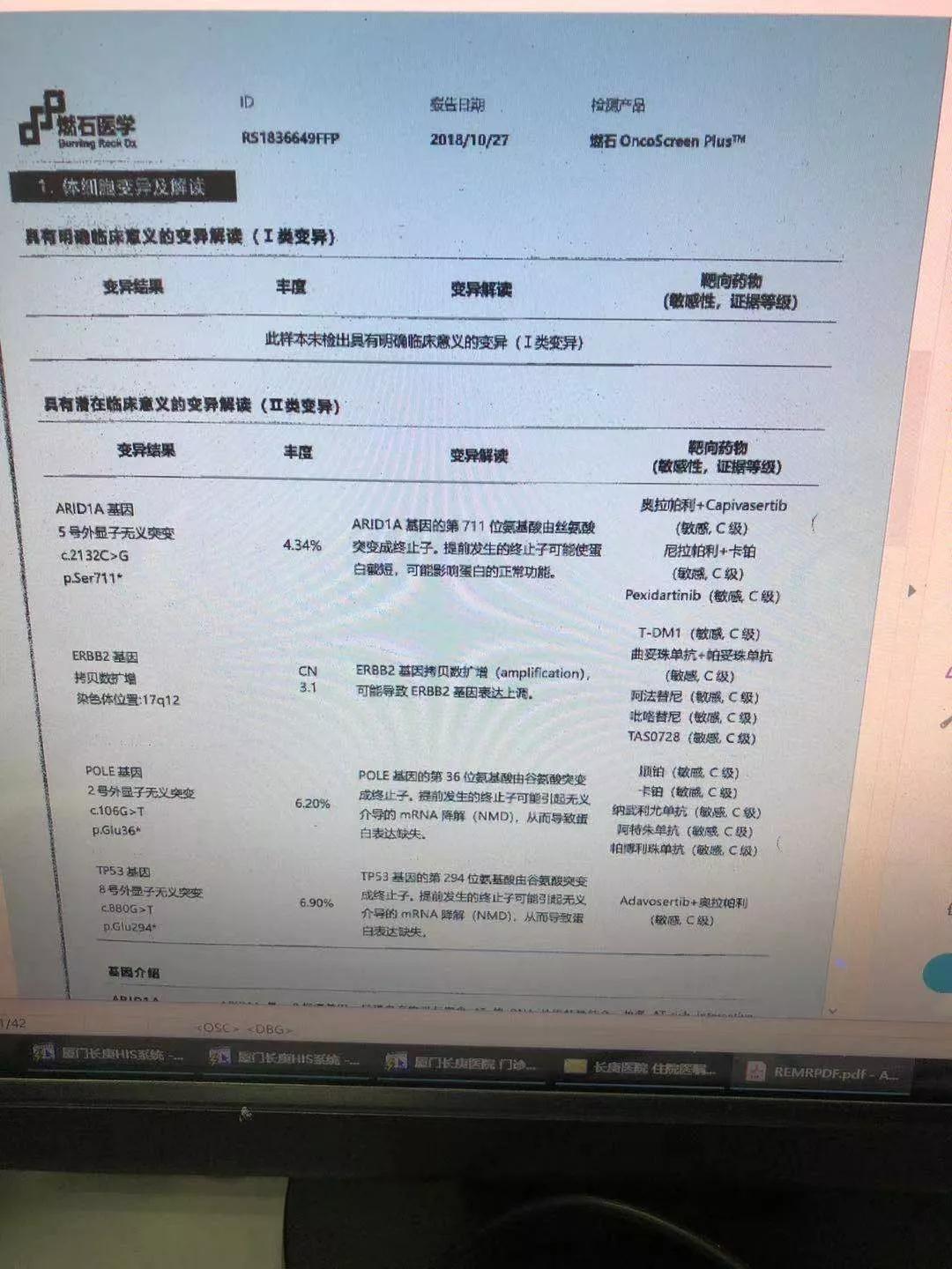 2018-10检测结果:PD-L1阴性;ARID1A基因4.34%,ERBB2基因CN=3.1,POLE基因6.2%,TP53基因6.90%