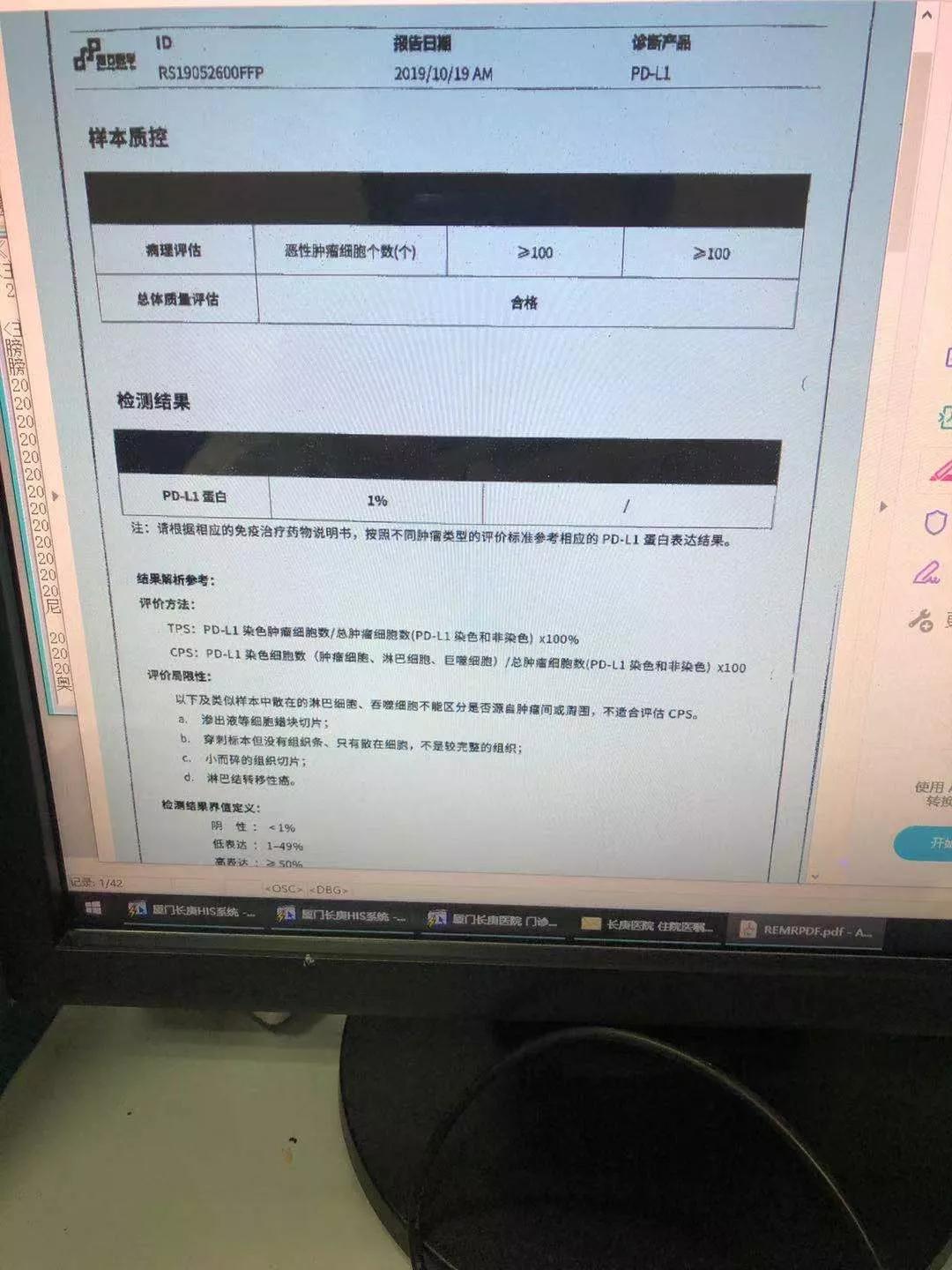 2019-10检测结果:PD-L1 1%;ARID1A基因7.20%,ERBB2基因CN=5.6,POLE基因4.61%,TP53基因5.81%。