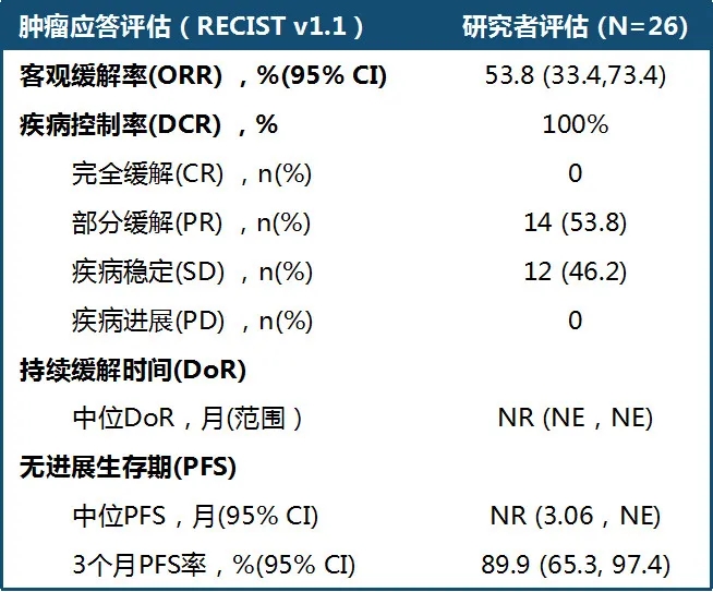 研究者评估的ORR为53.8%(14/26)(95% CI:33.4%-73.4%),DCR为100%(26/26),其中1例PR的受试者自第1次肿评起靶病灶持续CR,12例SD的受试者肿瘤均缩小;
