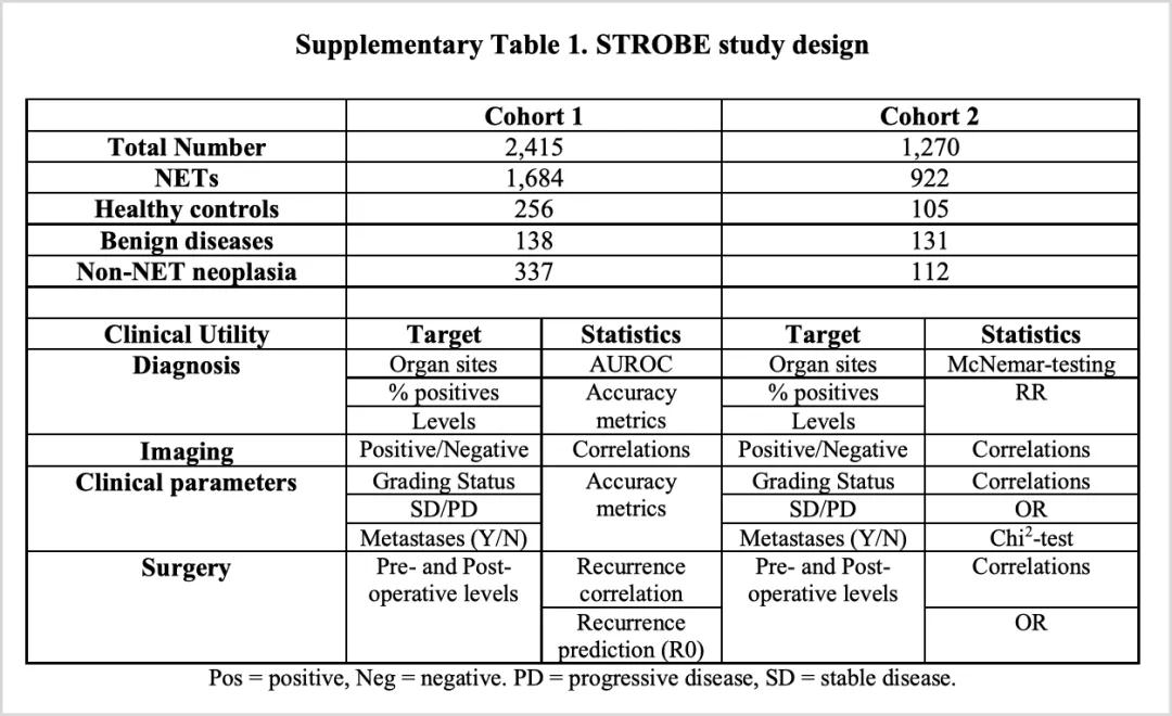 该研究为横跨多中心、多国家的观察性、前瞻性、比较性横断面队列研究。研究涉及2个队列,每个队列均包含健康对照组、良性病变组、非NET肿瘤组及NETs组:1)队列一:向受试者采集3 ml全血用于NETest检测,评估NETest在诊断、分期等方面的准确性;2)队列二:向受试者采集3 ml全血或血清,分别用于NETest或CgA检测,配对分析、对比NETest或CgA在诊断、分期及预测术后复发等方面的准确性。研究设计详见表1。