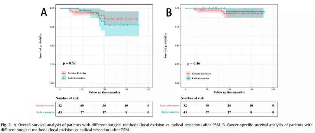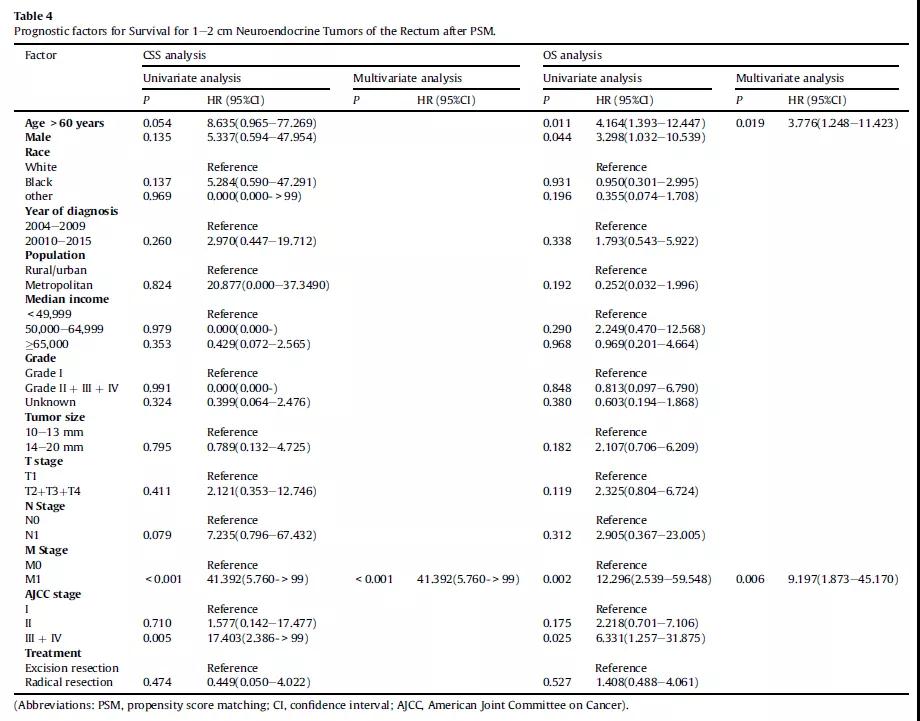 研究者从SEER数据库中提取10 - 20 mm RNET的临床病理学信息。采用1:2倾向评分匹配(PSM)法平衡局部切除组和根治性切除组之间不平衡的基线协变量(P < 0.05)。采用Cox比例风险模型确定与癌症特异性生存期(CSS)和总生存期(OS)相关的危险因素。