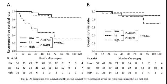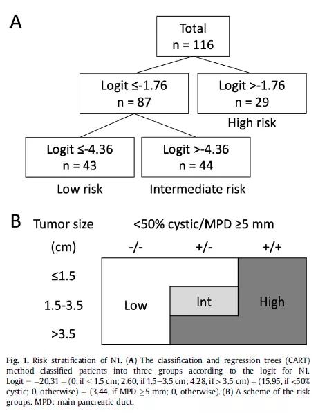 该研究共纳入131例患者。116例患者淋巴结经病理检查,其中23例(20%)为LNM。放射学肿瘤大小 [相较于1.5 cm,1.5 - 3.5 cm的OR为:13.5(95%CI:1.77 - 398),> 3.5 cm的OR为72.4(9.06-2257)],< 50%囊性成分(8.46×10^6, 1.68×10^6-),并且主胰管扩张≥5 mm(31.2,3.94-702)与LNM独立相关。当将患者分为低危组(43例患者)、中危组(44例患者)和高危组(29例患者)时,各组LNM的比例差异显著(分别为0%、14%和59%)。低、中危组的无复发生存率(RFS)明显优于高危组(5年RFS率分别为92.2%、85.4%、47.1%)。