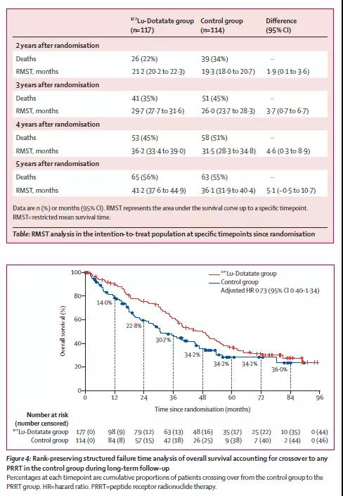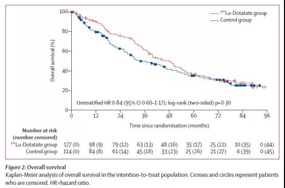 从2012年9月6日至2016年1月14日,231例患者入组并随机分配接受治疗。预设的最终分析发生在末例患者随机分配后5年(发生142例死亡时);177Lu-Dotatate组的中位随访时间为76.3个月(范围0.4 - 95.0),对照组为76.5个月(0.1 - 92.3)。未达到总生存期的次要终点:177Lu-Dotatate组的中位总生存期为48.0个月(95% CI 37.4 - 55.2),对照组为36.3个月(95% CI 25.9 - 51.7)(HR 0.84 [95% CI 0.60 - 1.17];双侧p = 0.30)。在长期随访期间,177Lu-Dotatate组111名患者中有3名(3%)记录到3级或更严重的治疗相关严重不良事件,但在安全性分析截止日期后未报告新的治疗相关严重不良事件。111名给予177Lu-Dotatate的患者中有2名(2%)出现骨髓增生异常综合征,其中1名在随机后33个月死亡(这是唯一报告177Lu-Dotatate治疗相关死亡的患者)。长期随访期间未报告新的骨髓增生异常综合征或急性髓性白血病病例。