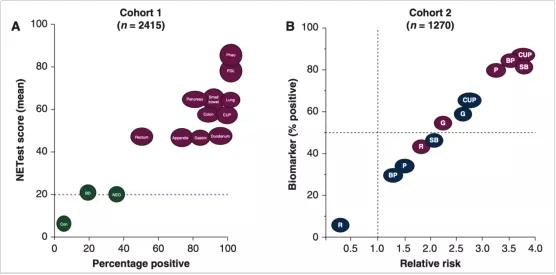1. NETest诊断准确率高,优于CgA:在队列1,NETest总的诊断准确率为91%,不同部位NETs的诊断准确率分别为:嗜铬细胞瘤&副神经节瘤(98%)、肺(96%)、小肠(94%)、胰腺(91%)、胃(80%)、阑尾(79%)和直肠(45%);详见图1A。在队列2,NETest诊断准确率(紫色圈)普遍高于CgA(蓝黑色圈),分别为87%与54%;同时,NETest的相对危险度显著优于CgA;详见图1B。