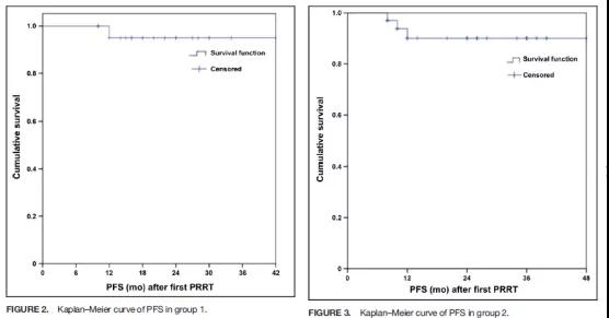 研究显示,77Lu-DOTATATE治疗后,57例患者中15例(26.3%)不可切除的原发灶变为可切除(第1组7例,第2组8例)。采用症状、生化、分子成像和解剖成像标准,分别在48例患者(84%)、23例患者(40%)、18例患者(31%)和23例患者(40%)中观察到PRRT的完全或部分缓解。第1组和第2组在2年时的PFS估计率分别为95%和90%。2组合并的2年OS为92.1%。在患有十二指肠神经内分泌肿瘤的患者、GEP-NETs无区域淋巴结受累的患者、原发肿瘤小于5 cm的患者、肝转移不大于1.5 cm的患者中,PRRT后原发肿瘤可切除的比率显著较高,肝转移灶不超过3个的患者,原发肿瘤18F-FDG摄取的患者SUVmax小于5。