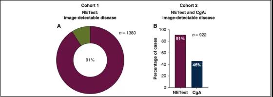 既往研究人员在超过10000个样本的大型癌症基因组图谱(TCGA)数据集中,通过对比分析筛选出了51个NETs相关基因,这些基因组合而成的基因团显示出了良好的神经内分泌标记能力。而本研究所用的NETest检测方法正是基于上述51个基因,通过特定算法和PCR检测技术开发出来的多基因组血液生物标记物,以专门识别具有神经内分泌基因型的肿瘤。从研究数据来看,NETest在NETs诊断及患者全程管理方面,展现出了广阔的临床运用前景。