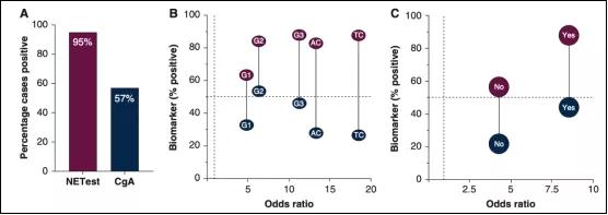 5. 在评估疾病状态、组织学分级与转移情况方面,NETest优于CgA:1)在进展性NETs中,NETest与CgA阳性率分别为95%与57%(图5A);在稳定性NETs中,则分别为78%与35%。2)在NETs分级中,NETest比CgA更准确(相同OR值情况下,阳性率更高)(图5B)。3)监测转移灶方面,NETest比CgA更准确(相同OR值情况下,阳性率更高)(图5C)。