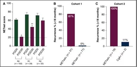6. 在预测术后复发方面,NETest优于CgA:1)NETs病例,术前NETest检测均阳性(68±3);R2切除术后,NETest检测值未见明显下降(60±6);R1或R0切除术后,NETest检测值均明显下降,分别为45±4与22±2(图6A)。2)R2或R1切除术后,NETest阳性率为100%;R0切除术后,NETest阳性率则为31%;值得注意的是,在R0组,NETest检测值正常病例在24个月随访期间均未复发,而NETest检测值阳性病例则有81%的患者出现术后复发(图6B)。3)在队列2亚组分析中:所有NETs病例术前NETest检测均阳性,CgA阳性率则为28%;R0切除术后,NETest与CgA阳性率分别为28%与7%,NETest阳性病人术后均复发,CgA阳性患者只有11%出现术后复发(图6C)。