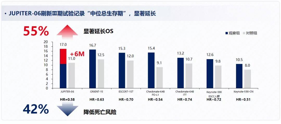 图1.晚期食管癌免疫联合化疗方案,临床III期研究中位OS数据汇总,JUPITER-06研究特瑞普利单抗17个月的中位OS为目前最长,较安慰剂组延长55%,患者死亡风险下降42%