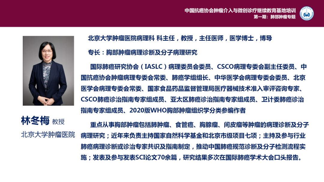 国际肺癌研究协会(IASLC)病理委员会委员、CSCO病理专委会副主任委员、肿瘤病理专家:林冬梅 教授