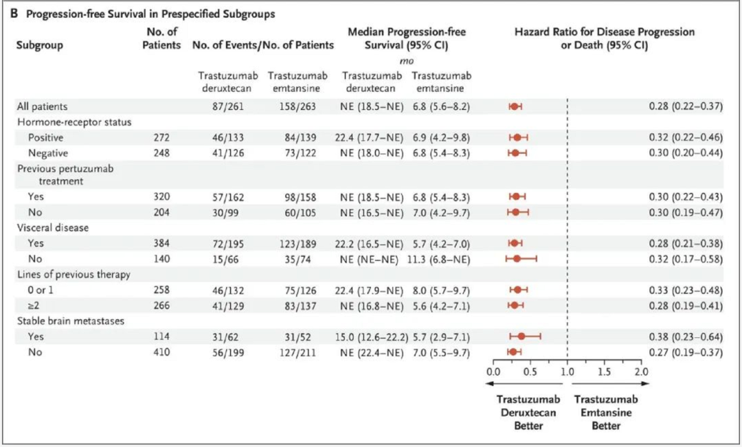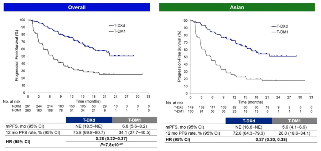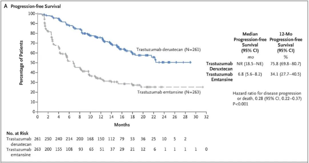 首先是T-DXd可以显著提高疗效。T-DXd组和T-DM1组的PFS(BICR评估)分别为未达到和6.8个月,进展或死亡风险显著降低72%(HR 0.28,95%CI:0.22~0.37;P<0.001);OS虽然尚未成熟,但已表现获益趋势(HR 0.55,95%CI:0.36~0.86,P=0.007);ORR则提高了一倍多(79.7% vs 34.2%)。