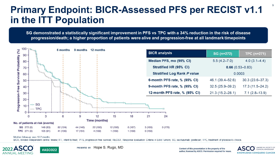 结果:数据截止至2022年1月3日,分别有272名和271名患者随机接受SG和TPC治疗。SG组与TPC组的患者特征相似(MBC患者既往接受化疗方案的中位数为3线[范围,0~8];95%有内脏转移,86%MBC接受过6个月以上的内分泌治疗,60%的患者之前接受过12个月内的CDK4/6 抑制剂治疗,38%的患者接受过超过12个月的CDK4/6抑制剂治疗。SG组(与TPC组相比)改善了中位PFS(5.5 vs 4.0 个月;HR=0.66;95% CI:0.53~0.83;P=0.0003);两组患者6个月和12个月的PFS率分别为46.1% vs 30.3%和21.3% vs 7.1%。