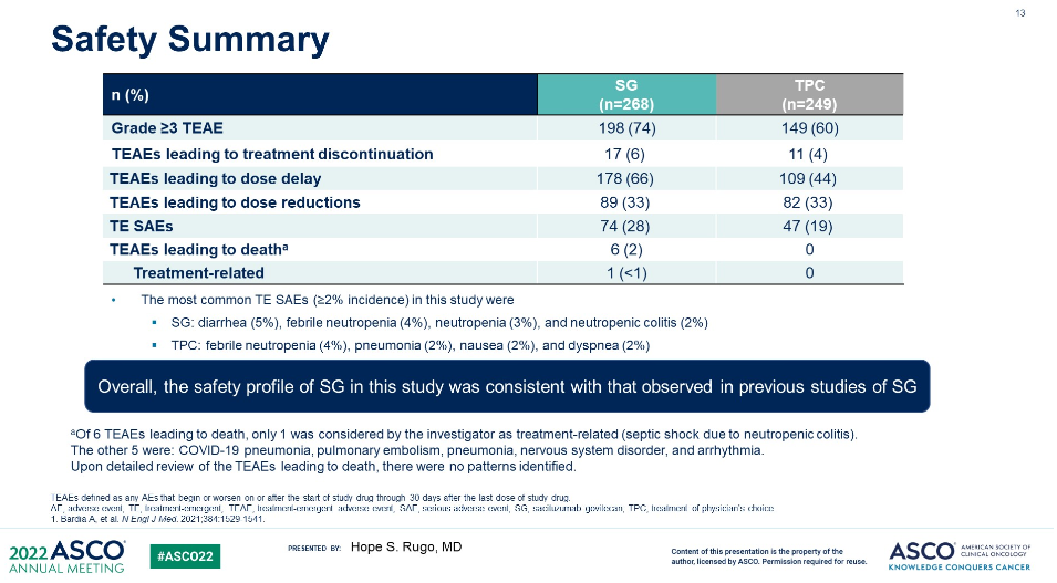 总体而言,SG组有74%的患者出现≥3级的不良事件(AE),TPC组有60%的患者出现了≥3级的不良事件;SG组vs TPC组中性粒细胞减少(51% vs 39%)和腹泻(10% vs 1%)最为常见。两组患者中因AE导致停药的患者比例较低,SG与TPC组分别为6% vs 4%。SG组有1例与治疗相关的死亡;TPC组中患者没有出现治疗相关的死亡。