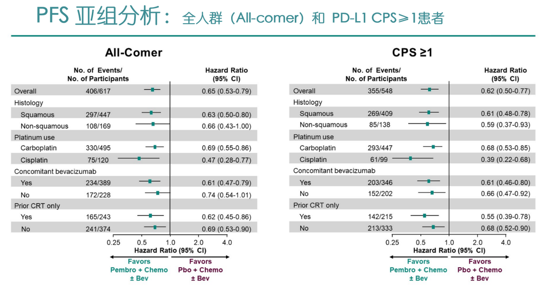 2022年ASCO大会则报道了KEYNOTE-826研究的亚组分析[4]。整体上,不同组织类型(鳞癌和非鳞癌)、铂类方案(卡铂和顺铂)、是否联合贝伐珠单抗、既往是否仅接受过放化疗(CRT)的患者均可从帕博利珠单抗联合治疗中获益;但鳞癌比非鳞癌(OS HR:0.61 vs 0.76)、顺铂比卡铂(OS HR:0.59 vs 0.69)、联合贝伐珠单抗比未联合贝伐珠单抗(OS HR:0.63 vs 0.74)、既往仅CRT比非仅CRT(OS HR:0.64 vs 0.71)的生存获益趋势更大。