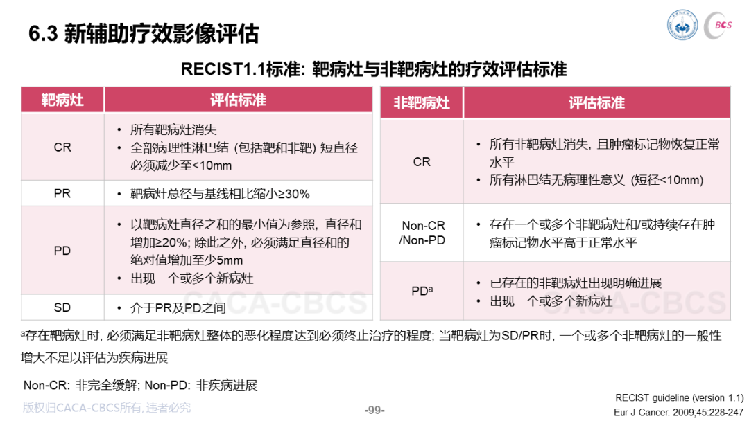 在NAC治疗期间,定期的疗效评估和监测也特别重要,指南中也明确告诉我们,新辅助的疗效评估主要依靠影像学来进行,评估结果分为CR、PR、PD、SD等等,只有通过这样的判断才能评估当前的治疗方案对于患者是否合适,如果出现SD的结果,指南上也有相应的后续方案推荐和指导,例如HER2阳性乳腺癌,如果2周期评估疗效不佳,可以继续使用原方案,持续观察,如果4周期评估依旧SD,就需要进行手术,并在手术后更改辅助阶段的方案或者直接更换一个新辅助治疗的方案;针对TNBC也同样是类似推荐。