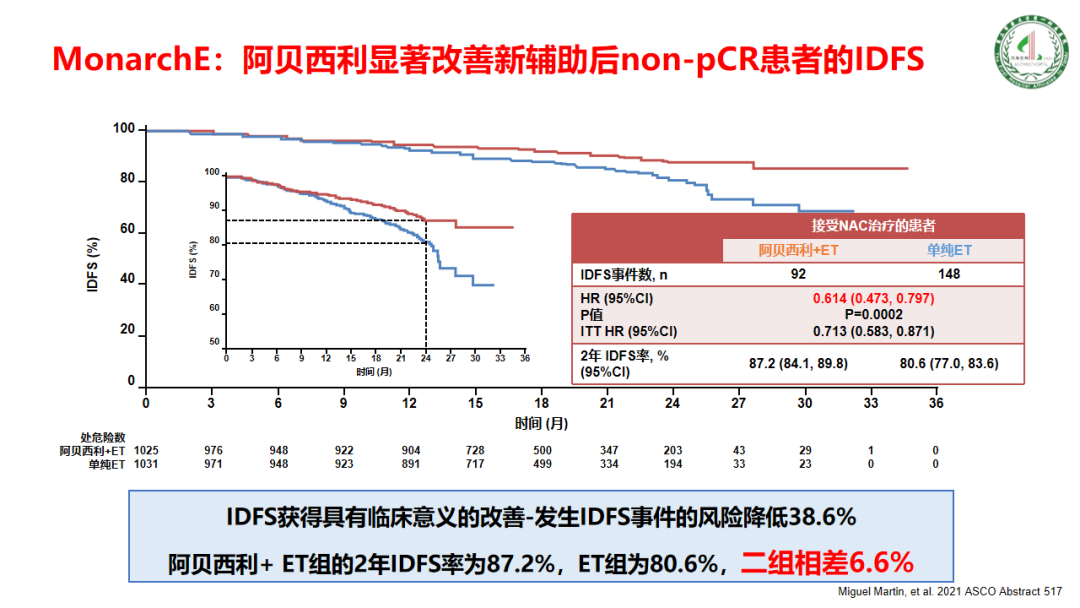 重点是对于预后较差的non-pCR的患者,如何为他们找到更好更合适的术后辅助治疗的策略,我们来看一下对于激素受体阳性的患者,MonarchE研究显示:阿贝西利可以显著改善新辅助后non-pCR患者的IDFS,在2年时间,绝对获益可以达到6.6%。