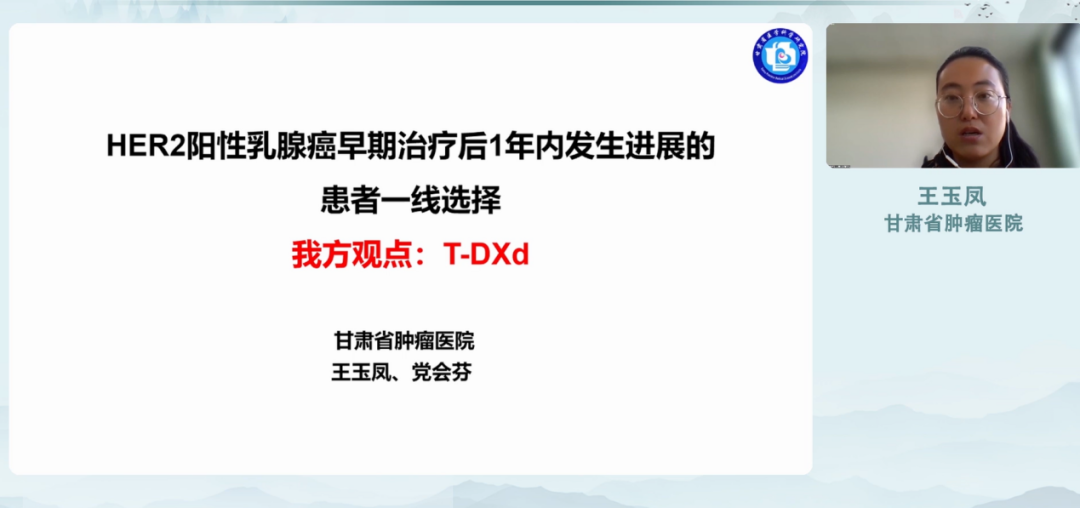 正方一辩——甘肃省肿瘤医院王玉凤医生首先阐明了自己的观点,认为HER2阳性乳腺癌早期治疗进展后的一线治疗应优选T-DXd。而后,王玉凤医生将辩论题目拆解为三个部分:一年内进展如何进行定义?何为一线治疗?早期治疗的方案又有哪些?并逐一进行了论述。