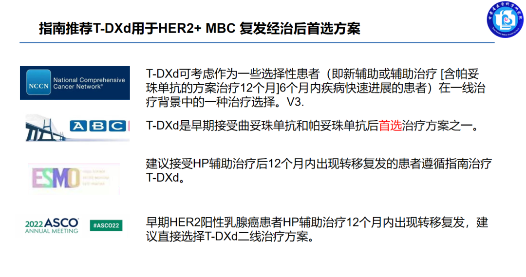 王玉凤医生指出,对于HER2+晚期乳腺癌的治疗,指南逐步淡化了一线、二线的概念,但在临床实际治疗中也要根据患者对H治疗的敏感性进行分层,从而选择最优治疗方案。由此看来,题目中的“一线”可以理解为复发转移后经治的第一个方案。ASCO、NCCN、ESMO等指南推荐T-DXd可作为HER2+晚期乳腺癌THP经治一年内复发转移后的首选方案。
