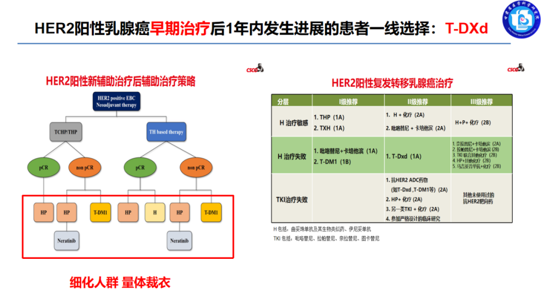 对于新辅助治疗后的non-pCR患者,应用T-DM1进行强化治疗。CSCO BC指南推荐,新辅助non-pCR患者,应根据MP分级进行后续治疗,当MP分级为3级和4级时,仍然推荐双靶治疗。