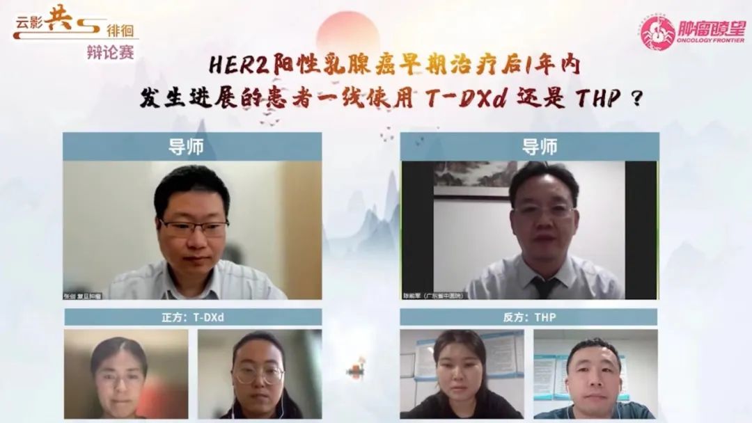HER2阳性乳腺癌早期治疗进展后的一线治疗策略该如何进行选择?2022年8月16日19:00~20:00,在二位导师——复旦大学附属肿瘤医院张剑教授和广东省中医院陈前军教授的带领下,一场关于“HER2阳性乳腺癌早期治疗后1年内发生进展的患者一线使用T-DXd还是THP?”的辩论拉开。