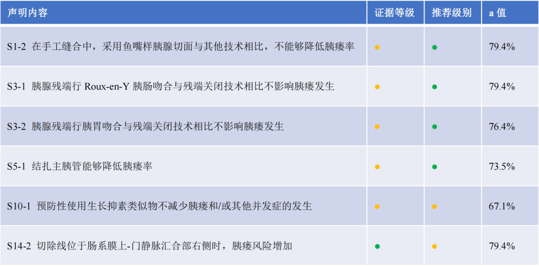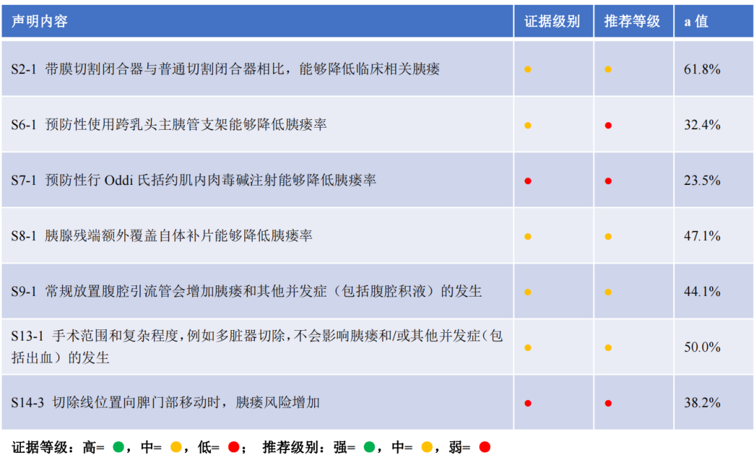 各位专家在充分研讨后经统计汇总,共在14项胰体尾切除术后残端处理的相关问题中达成5项共识。