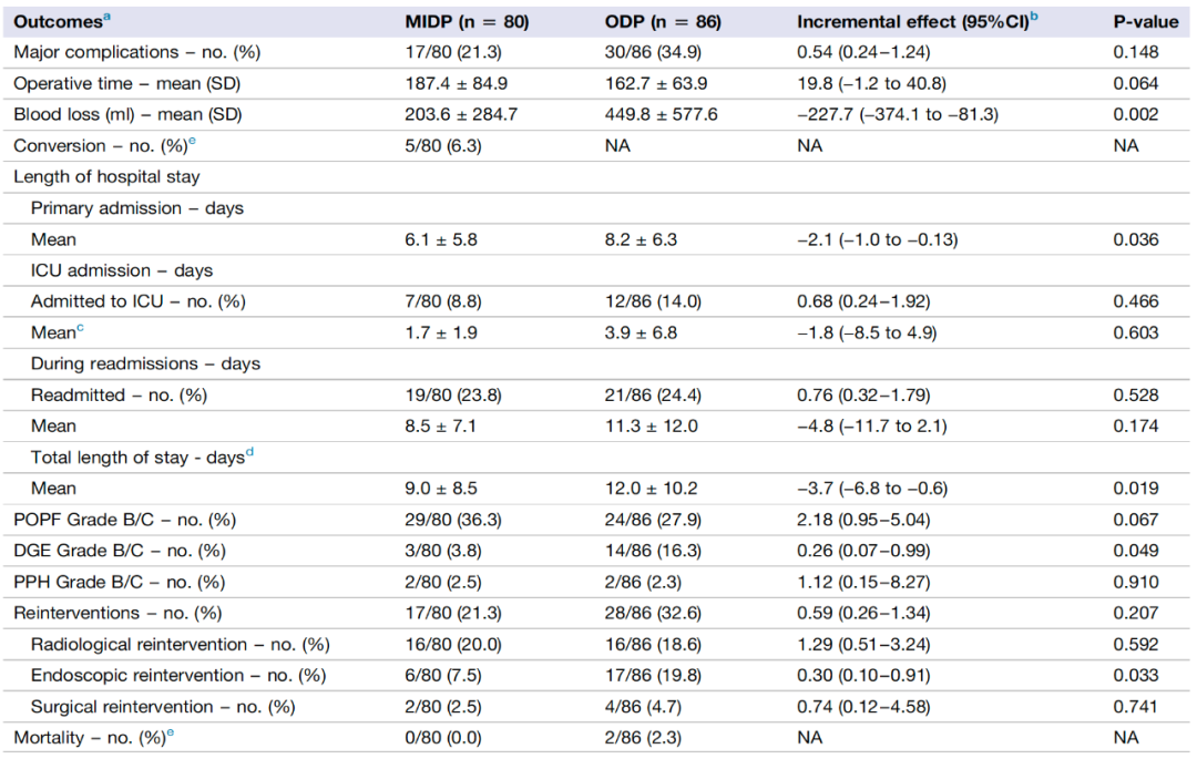 Korrel等人发表于2021年的个体患者数据荟萃分析,纳入了2项随机对照研究中共计166例胰体尾切除病例,结果显示与开放手术相比,微创胰体尾切除术能够改善住院时长及胃排空障碍等临床结局,但对胰瘘发生无影响,结论与原ISGPS专家共识表述相一致。