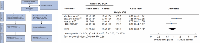 △CPR研究的Consort研究流程图及所附荟萃分析有关于生物补片对胰瘘发生影响的森林图
