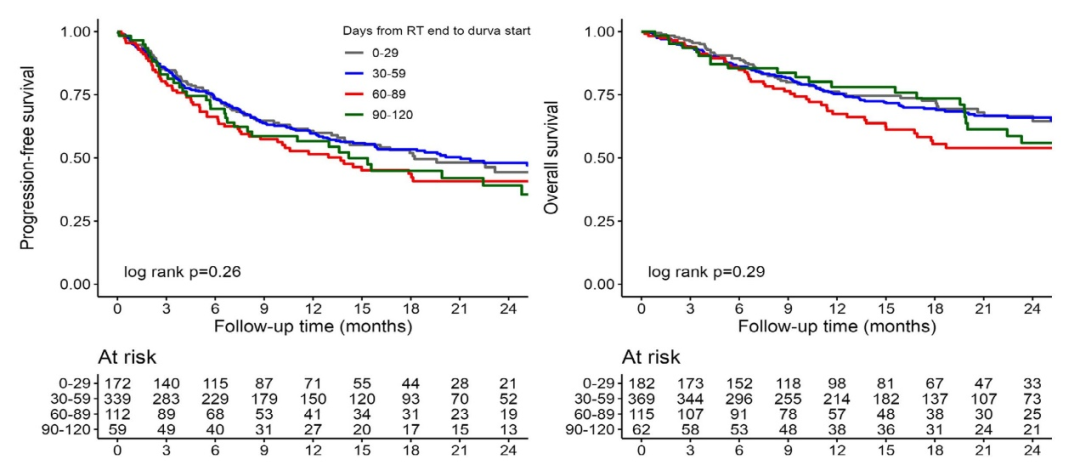 在该研究中,中位度伐利尤单抗治疗的起始时间为41天,研究者以0~29天、30~59天、60~89天、90~120天为4个时间节点,中位随访时间17.6个月,并未发现免疫治疗起始时间与患者的PFS(P=0.26)及OS(P=0.29)有关。