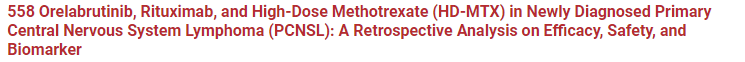 奥布替尼是一种新研发的BTK抑制剂,具有高度的选择性,其对于PCNSL治疗的最显著优势在于可更易透过血脑屏障,研究表明,奥布替尼150mg剂量下的脑脊液中药物浓度显著伊布替尼的不同剂量组(560/700/840mg),分别为15.66 vs 1.4 vs 1.98 vs 1.33ng/mL,这无疑在PCNSL治疗中殊为关键。为此,我们发起了多中心研究(abstract 558)来分析RMO方案(奥布替尼+利妥昔单抗+大剂量甲氨蝶呤)在新诊断PCNSL中的疗效和安全性。本研究参与单位除了我们中心外,还有还有重庆大学附属肿瘤医院的刘耀教授团队,河南省人民医院朱尊民教授团队,山西省人民医院贺建霞教授团队,河北医科大学四院刘丽宏教授团队,大连医科大学附二院王晓波教授团队,内蒙古兴安盟人民医院赵玉霞教授团队。RMO治疗初治PCNSL的多中心研究发现,该方案能显著改善疗效,ORR高达100%,CR率也显著提高,达到了62%,并且接受6个疗程RMO方案治疗的患者中可进一步提升CR至88.9%,即便对于MYD88突变的PCNSL患者,其CR同样达到了60%(3/5),此外,安全性是较为可靠的,AEs发生率为17.65%,仅2例(5.88%)发生≥3级的AEs。但是需要注意的是,本研究中有2例患者在4疗程后出现疾病进展,因此,选择自体造血干细胞移植或全脑放疗进行巩固治疗对于减少复发和治愈患者PCNSL具有极其重要的价值。总体而言,奥布替尼+利妥昔单抗+大剂量甲氨蝶呤对于PCNSL一线诱导治疗是较为不错的选择,能带来不俗的疗效和可靠安全性。