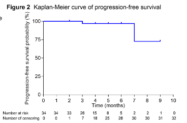共纳入34例新诊断PCNSL患者,中位年龄为58.5岁,其中4例(11.8%)患者的ECOG评分≥3,经过RMO方案治疗后,结果显示:①所有患者的总体缓解率(ORR)为100%,完全缓解率(CR)达到了61.8%(21/34);②18例PCNSL患者接受了6个疗程RMO方案治疗,在第6个疗程结束评价疗效时,其ORR仍然维持了94.4%(17/18),且CR高达88.9%(16/18);截至2022年6月30,8例患者进行了奥布替尼维持治疗,并仍处于完全缓解状态;③22例患者接受了基因突变的检测,其中18例伴有MYD88突变,经过RMO方案治疗后ORR为100%,CR达到55.6%;④在奥布替尼治疗第15天(用药后2h)时,对5例患者进行了腰穿并检测了奥布替尼在脑脊液中的浓度,发现其血药浓度为21.6 ng/ml,而这5例患者3例达到CR,2例为部分缓解(PR);⑤在生存方面,中位PFS尚未达到,6个月PFS达到97%(见下表),中位OS也未达到;⑥安全性方面,17.65%患者出现了不良反应(AEs),最常见的AEs为血细胞减少(8.82%),仅有2例患者的AEs为≥3级。