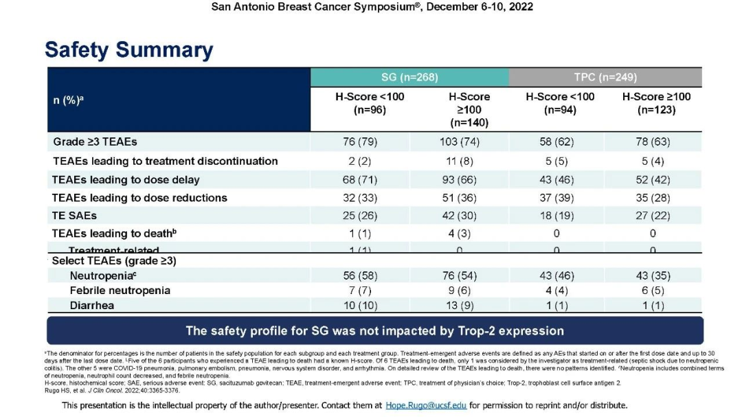 不同H评分患者的安全性基本一致,Trop-2表达水平与不良反应发生率无关,常见不良反应主要为中性粒细胞减少、发热性中性粒细胞减少、腹泻。