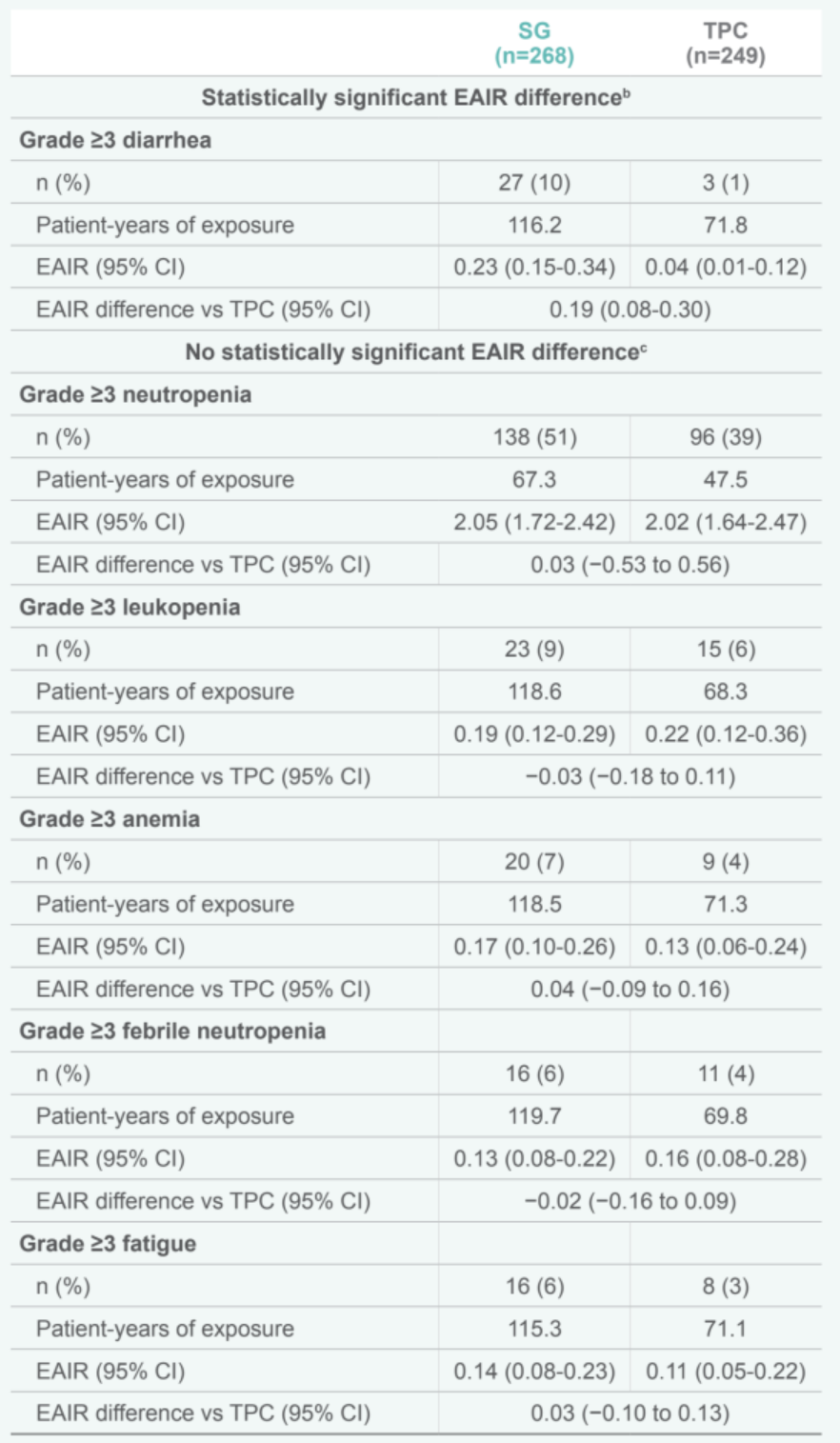 在常见的≥3级TEAEs中,SG组患者仅有腹泻(0.23 vs 0.04)的EAIR显著高于TPC组,而中性粒细胞减少(2.05 vs 2.02)、白细胞减少(0.19 vs 0.22)、贫血(0.17 vs 0.13)、中性粒细胞减少性发热(0.13 vs 0.16)、疲劳(0.14 vs 0.11)的EAIRs与TPC组无显著差异(见下表),这些数据表明校正暴露后,绝大多数SG的不良事件发生率与TPC相似。