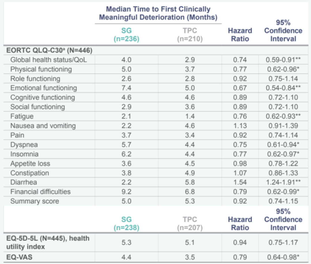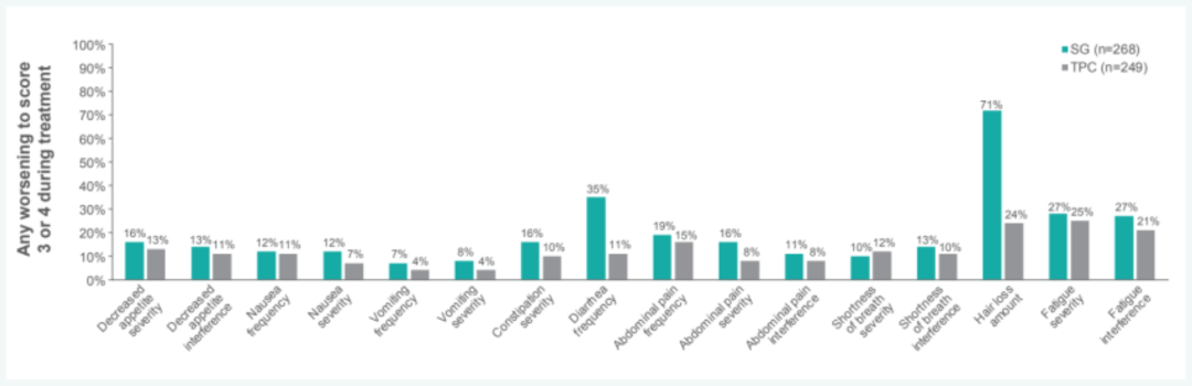在PRO-CTCAE相关症状中,SG组和TPC组的食欲不佳、恶心、呕吐、便秘、腹痛、呼吸短促、疲劳等症状恶化3/4分的比例均相似,SG组只有腹泻频次(35%vs 11%)、脱发量(71%vs 24%)高于TPC组。