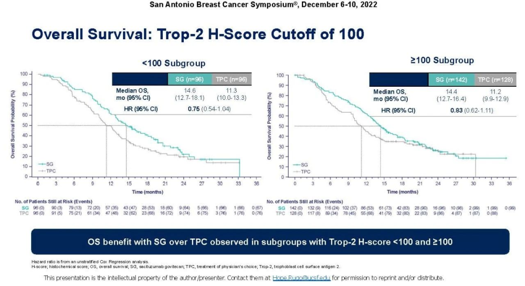[1]Hope Rugo,et al.Overall survival(OS)results from the phase III TROPiCS-02 study of sacituzumab govitecan(SG)vs treatment of physician’s choice(TPC)in patients(pts)with HR+/HER2-metastatic breast cancer(mBC).ESMO 2022;LBA67