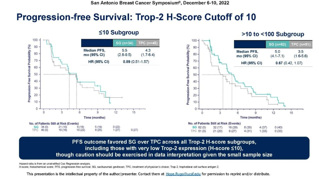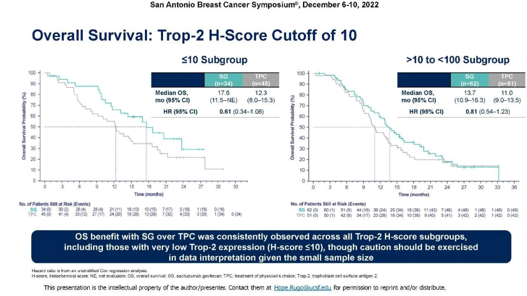然而,需注意的是,TROPiCS-02研究中的低表达(H评分<100,n=96)、尤其是极低表达(H评分0~10,n=34)患者的样本量较小,也并非统计学预设亚组,需谨慎解读结果。此外,在检测标本中,原发灶与转移灶的比例尚不清楚,对于Trop-2在转移性疾病中的表达还需要进一步探索。再者,此次亚组分析是在各研究中心完成病理检测而非中心实验室、Trop-2染色强度的H评分可能存在判读差异、且目前尚无可指导治疗的准确临界值,这项研究中H评分界值与ASCENT研究也有所差异,这或许是考虑到不同分子分型之间表达差异所致。