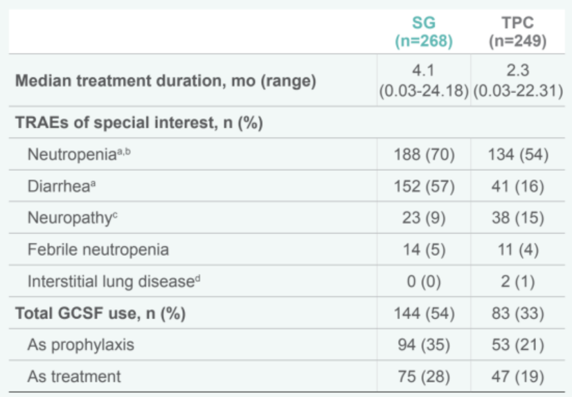 至数据截止时,SG组有18例(7%)、TPC组有4例(2%)患者仍在接受治疗,SG组的中位治疗持续时间是TPC组的近2倍(4.1 vs 2.3个月)。两组患者的停药都是主要由于疾病进展所导致(78%vs 79%)。两组的不良事件绝对发生率与既往报道一致(见下表)。