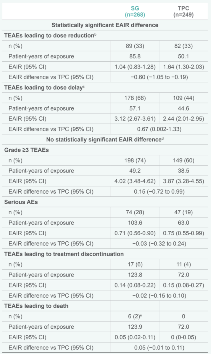 SG组中引起减量的治疗期间不良事件(TEAEs)、严重TEAEs、治疗中断TEAEs的绝对发生率与TPC组相似,但相应的EAIRs分别降低0.6(1.04 vs 1.64)、0.03(0.71 vs 0.75)、0.02(0.14 vs 0.15);SG组的剂量延迟TEAEs、≥3级TEAEs、死亡TEAEs的绝对发生率高于TPC组,但相应的EAIRs相似,差异仅为0.67(3.12 vs 2.44)、0.15(4.02 vs 3.87)、0.05(0.05 vs 0)(见下表)。