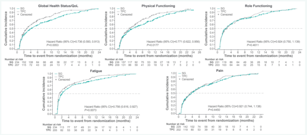 两组患者的上述评估量表完成率和基线得分均相似。在EORTC QLQ-C30量表评估中,SG组和TPC组患者的角色功能(HR 0.924,P=0.4611)和疼痛(HR 0.921,P=0.4450)TTD没有显著差异;但SG组患者的总体健康状态(GHS)/QoL(HR 0.736,P=0.0053)、躯体功能(HR 0.771,P=0.0177)和疲劳(HR 0.756,P=0.0073)TTD均较TPC组均有显著延长。