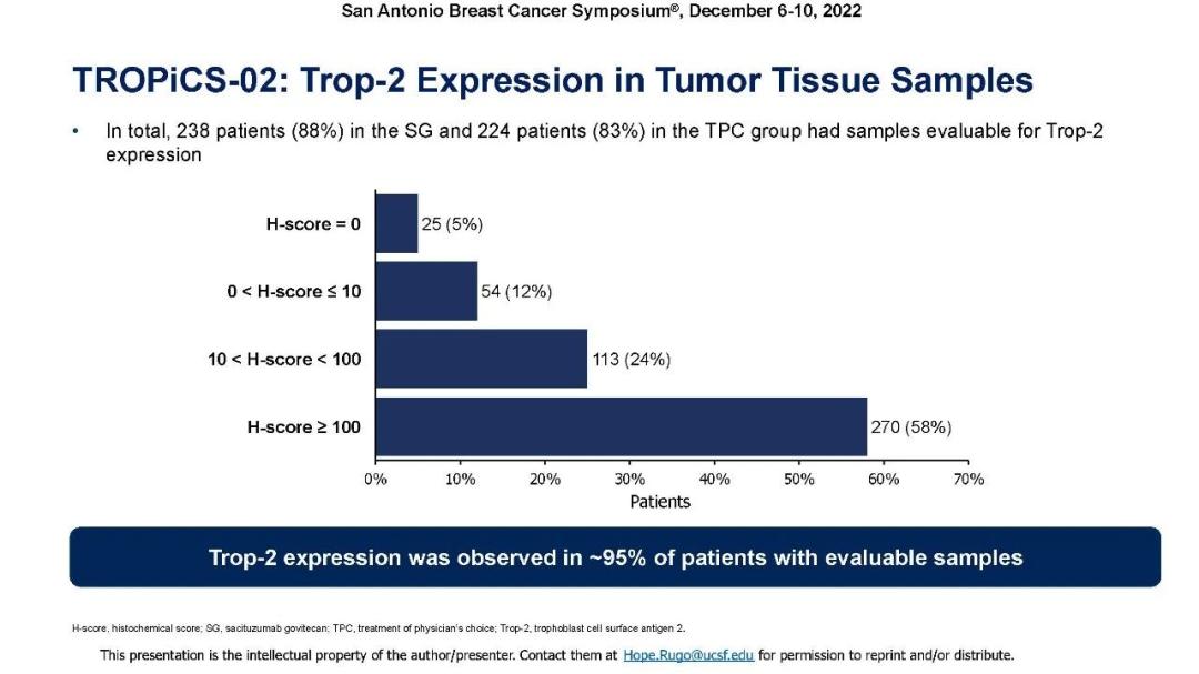 在纳入该亚组分析的患者中,95%的患者存在Trop-2表达阳性,其中58%的患者为Trop-2中高表达(H评分≥100)。