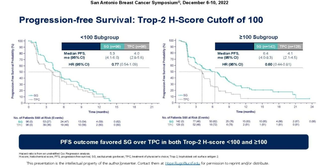 [6]Hope Rugo,et al.Sacituzumab Govitecan(SG)vs Treatment of Physician’s Choice(TPC):Efficacy by Trop-2 Expression in the TROPiCS-02 Study of Patients(Pts)With HR+/HER2–Metastatic Breast Cancer(mBC).SABCS 2022;GS1-11