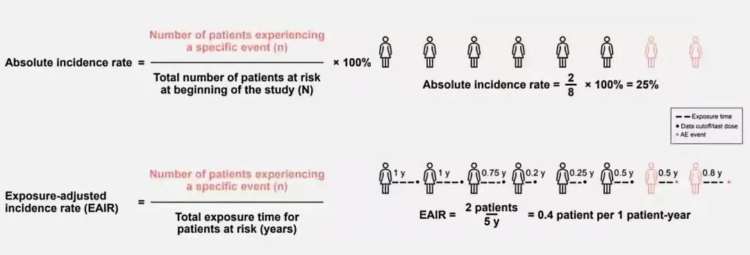安全性和耐受性是晚期患者治疗决策的重要内容。在临床研究中,通常使用不良事件的绝对发生率来评价各治疗组的安全性。然而,随着治疗持续时间的延长,药物暴露时间越长的患者,不良事件累积发生风险通常越高;此时需要通过校正暴露时间才能客观反映各治疗组的安全性差异[3]。尤其是对于预后较好、生存期较长的HR+/HER2-患者,更适合采取暴露校正发生率(EAIRs,即经历特定不良事件的患者数量除以患者暴露时间)来比较不同治疗的安全性特征。