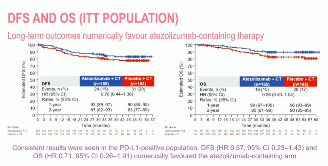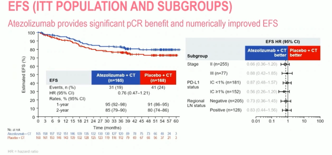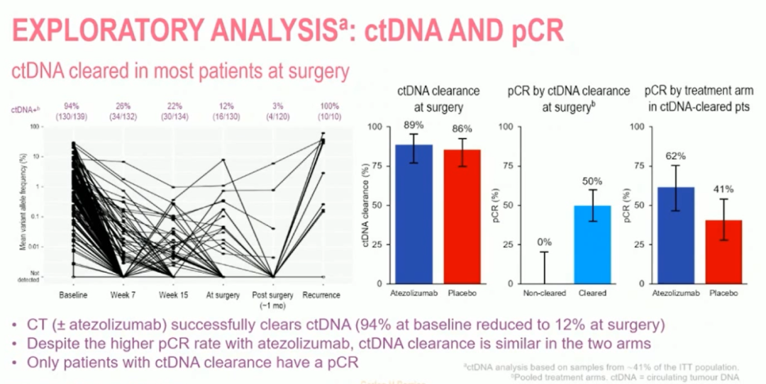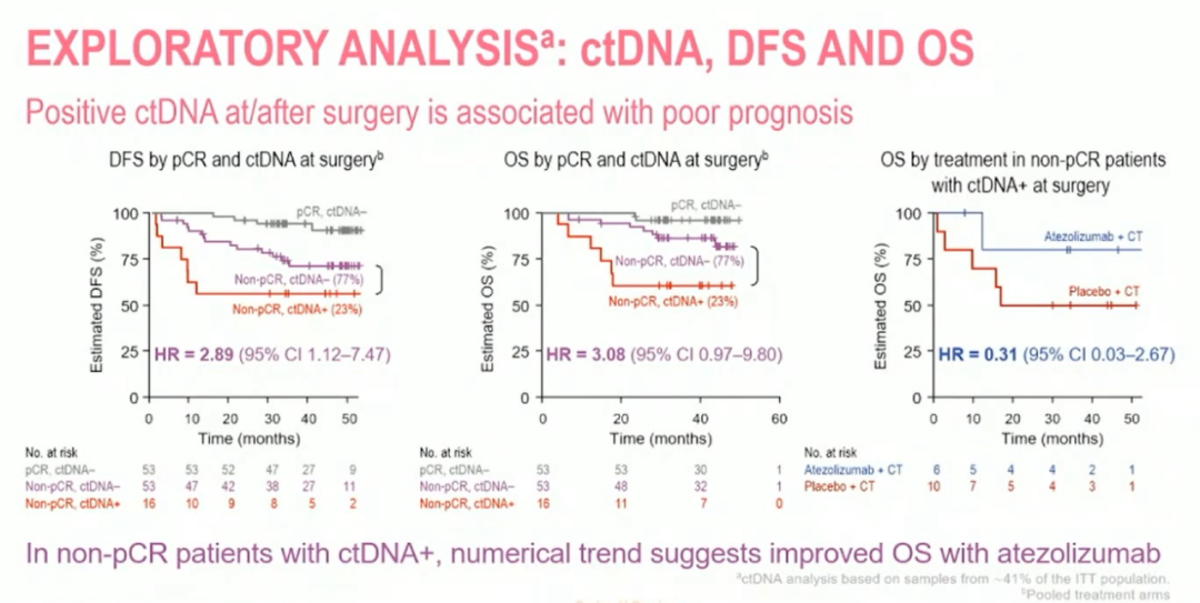 另一方面,ctDNA阳性且有残留病变的患者预后最差。在最后一个预后最差、未达到pCR且ctDNA仍阳性的亚组中,阿替利珠单抗似乎显示出了一些获益,提示能为这个特殊且难治的患者群体提供更好的治疗结果。虽然这只是一项初步的探索性分析,但可以肯定的是,我们应该在这一患者人群中进一步研究ctDNA。