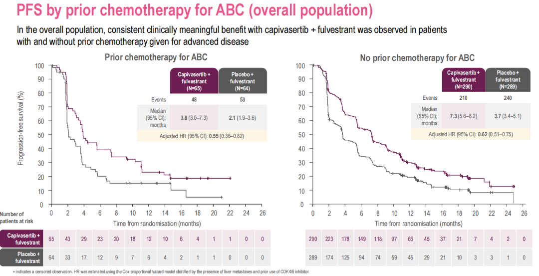 总体人群中,在既往因晚期乳腺癌接受过和未接受过化疗的患者中,我们均观察到了capivasertib+氟维司群使患者有一致的获益。