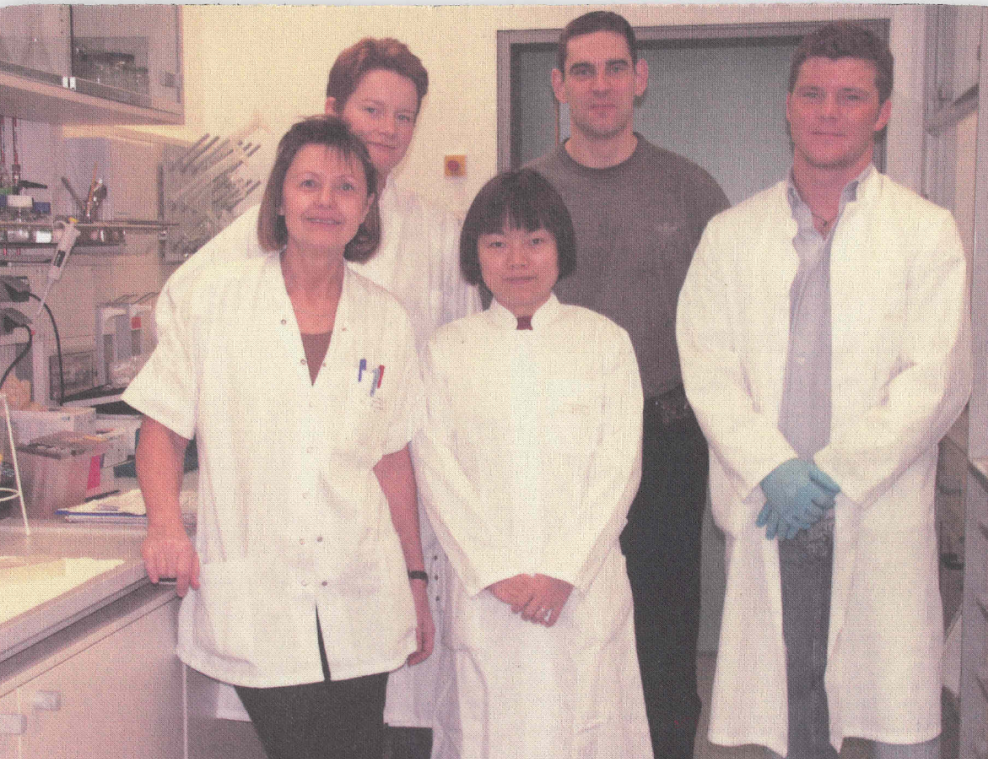 左起:沈祖尧教授,陈洁,于君教授,陈旻湖教授,香港中文大学实验室,2000年