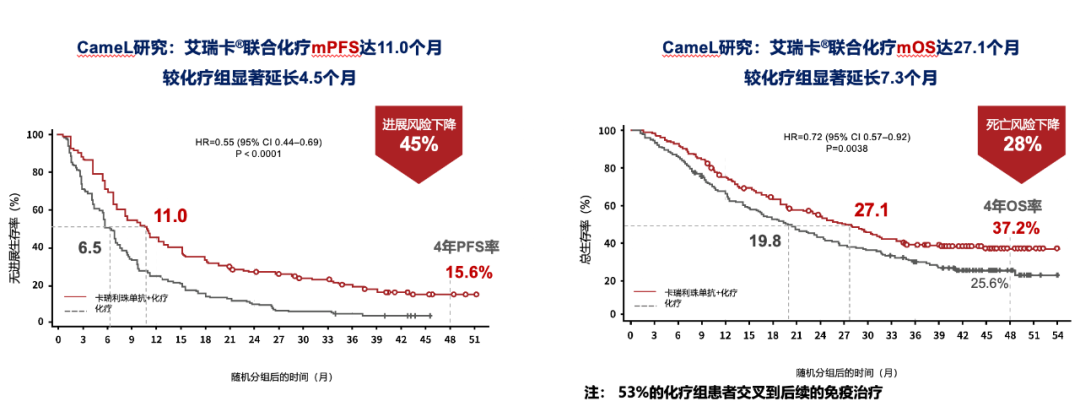 卡瑞利珠单抗联合化疗一线治疗非鳞和鳞状NSCLC患者,是目前唯一取得双OS阳性且mOS最长,均超越27个月的国产PD-1抑制剂。非鳞癌中,4年OS率37.2%,使超1/3患者生存突破4年。CameL和CameL-sq相互印证,给患者带来长生存获益,达到“临床治愈”。
