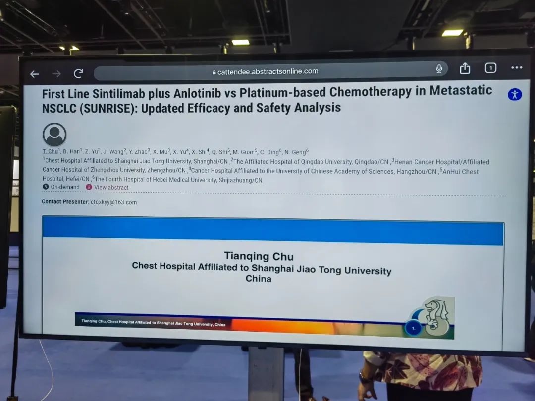 韩宝惠教授分析了上海市胸科医院呼吸内科团队的另外两项研究,其中SUNRISE研究比较了信迪利单抗联合安罗替尼与铂类化疗一线治疗转移性NSCLC的疗效和安全性(摘要号EP11.02-03),另一项的主题为“抗血管生成治疗还是免疫治疗:EGFR/HER2外显子20插入突变晚期NSCLC患者的多中心研究”(摘要号EP11.03-19)。